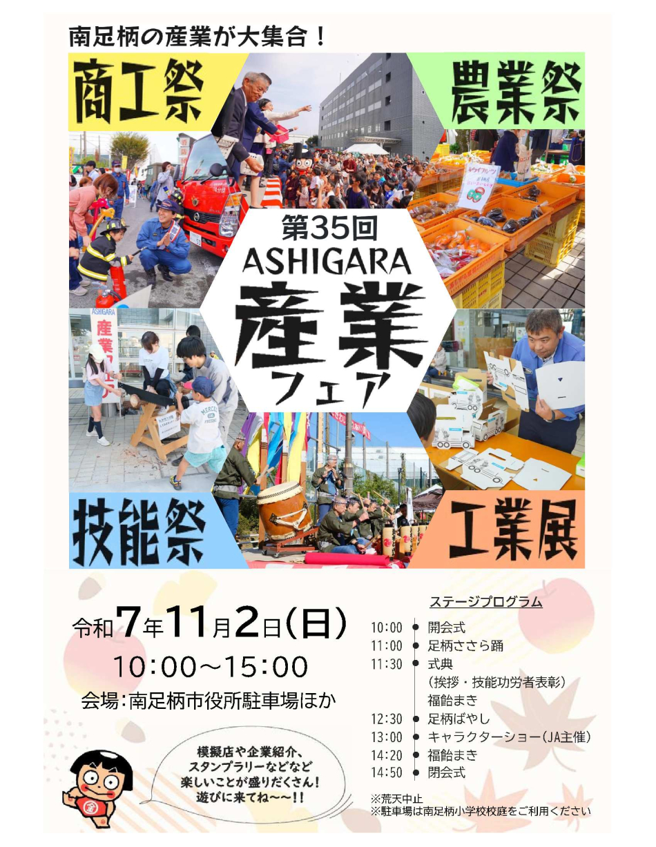 南足柄市内の商業や農業、工業、技能者の元気な姿を見ていただくイベントで、「農業祭」「技能祭」「にぎわいふれあい商工祭」「工業展」「特別展」などもあり、市内の産業を楽しく知る事ができます。