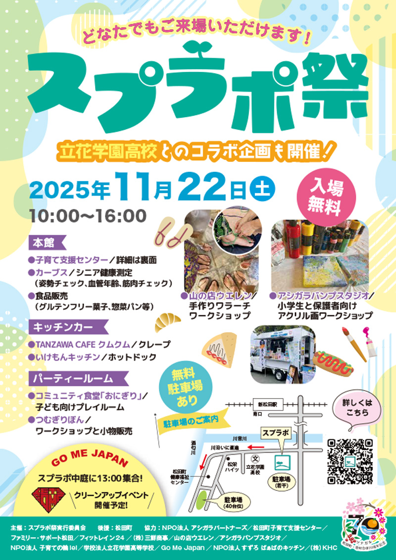 立花学園高校とのコラボ企画や健康測定、グルテンフリー菓子販売、手作り体験、キッチンカーグルメなど盛りだくさんの内容。