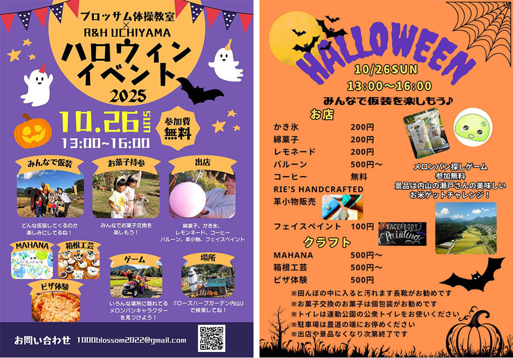 自然豊かな内山の田んぼに、ハロウィンの飾り付けが施され、子供たちが元気いっぱいにパーティを楽しみました。宝さがしやお菓子交換で笑顔があふれる中、親子体操教室のBLOSSOMさんが手作りの迷路ゲームで子供たちを楽しませ、大いに盛り上がりました。