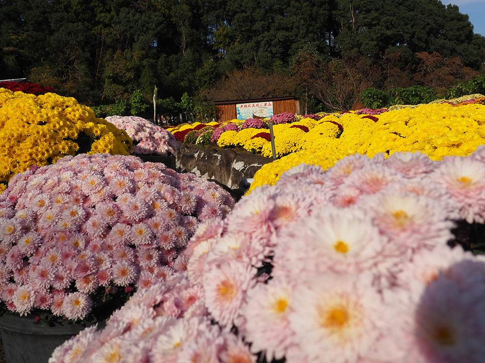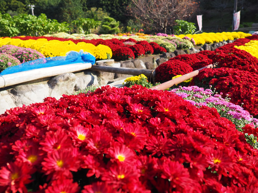 見頃は11月上旬ごろまで。青空と里山の緑を背景に、ざる菊のカラフルなグラデーションが映えるこの時期は、絶好の写真スポット。