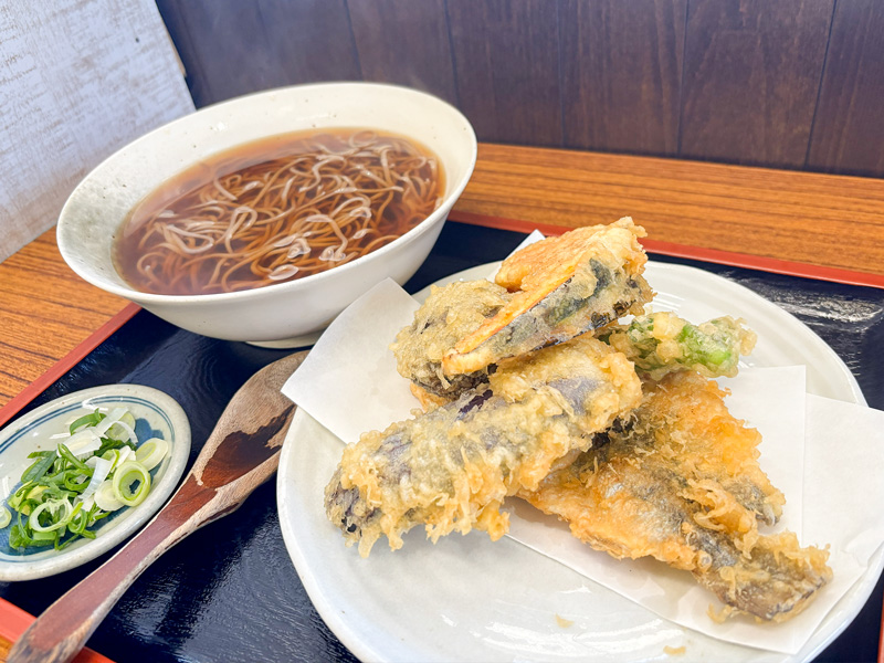 少し甘めのつゆが絡むお蕎麦に。大きくて新鮮な季節野菜、そして中はふっくら柔らかいお魚の天ぷらがセットになっていて、ボリューム満点!天ぷらは揚げたてでサクサク!大満足の内容でした。