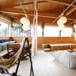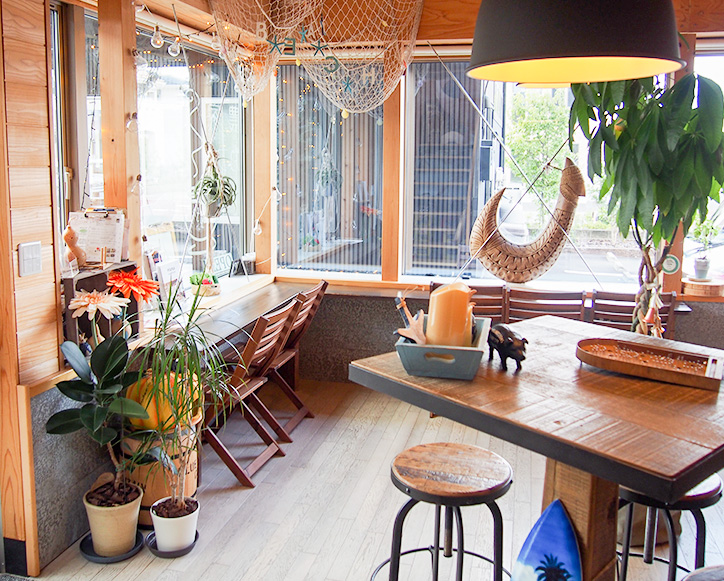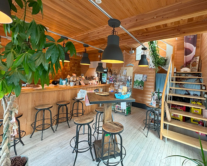 木のぬくもりに包まれたやさしい雰囲気の店内。1階は「海」、2階は「山」をイメージした内装で、それぞれの空間の魅力を楽しみながら、ゆったりとした時間を過ごせます。