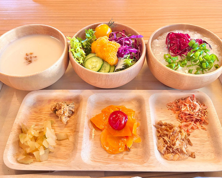 野菜の美味しさを活かしたメニューが充実のカフェ。トッピングが選べて、おかわりも自由な「おかゆランチ」は、やさしい味わいで身体の芯から温めてくれ、心も体もほっと癒されるます。