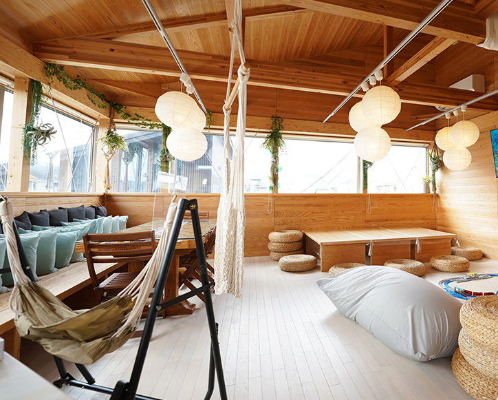 「みんなで作り上げるカフェ」をコンセプトに、2階にはキッズスペースを設け、ナイトカフェや交流会など多目的な利用が可能。ワークスペースとしても活用できるので、ぜひお気軽にお問い合わせください。