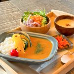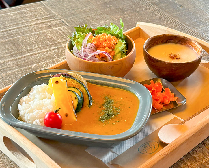 「自家製スパイスカレー」はオイル、小麦、お肉は使用せず、7種類のスパイスとバターで風味豊かに仕上げたお店の人気メニュー。他にも「野菜ポタージュ」や「オーガニックドリンク」など身体に良さそうなものがたくさんで嬉しい。