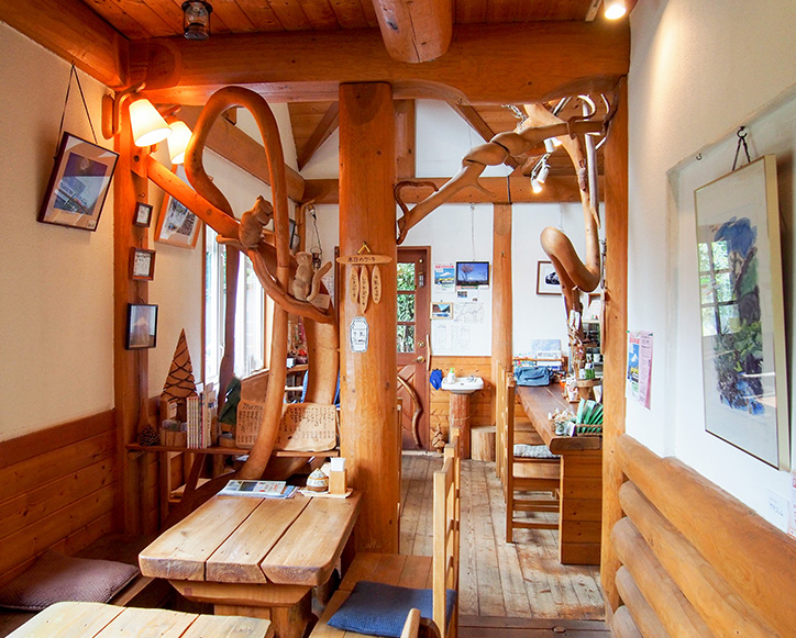 仲間と共に1年以上かけて建てたログハウスは、どの席に座っても絵になる景色が楽しめ、都会の方にリピーターが多いそう。日帰りで大野山に来る方が御殿場線の時間調整に使うことも。手作りの絵本や玩具が用意されていて、小さなお子様も大歓迎!「四季折々の季節が体感でき、毎日がとても楽しい」と店主。野鳥や木々を眺めながら、のんびりしたくなるお店です。