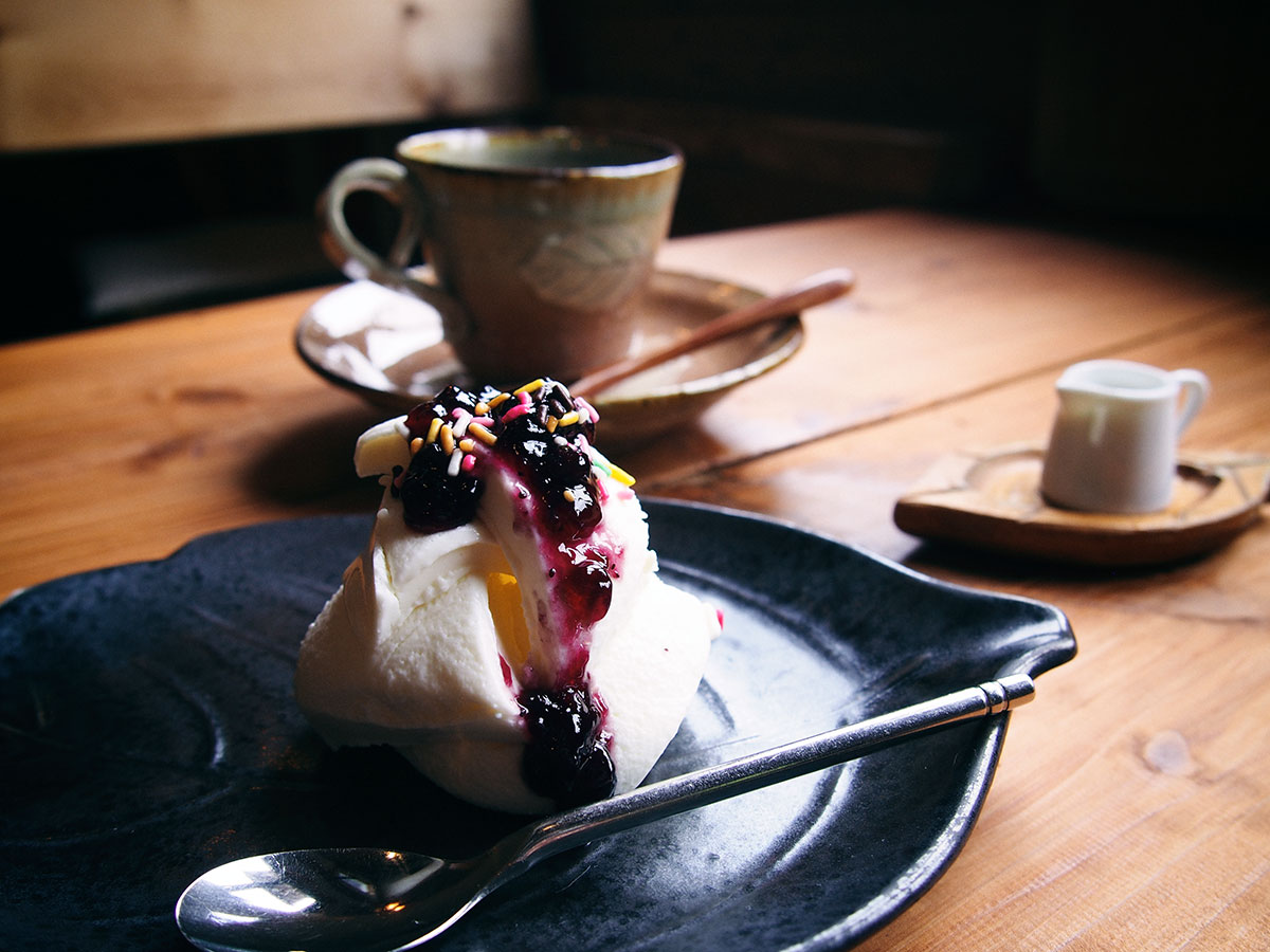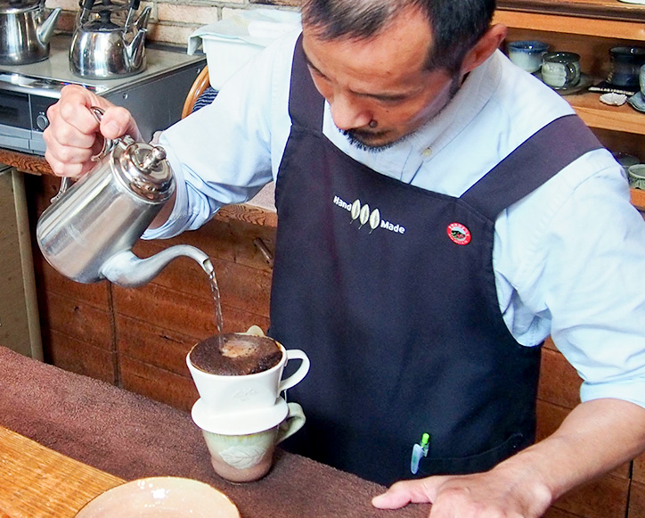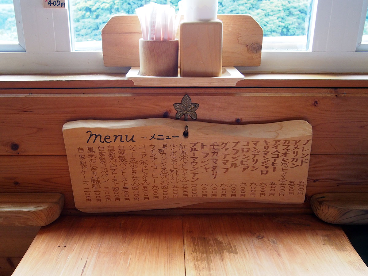 毎日洒水の滝まで水を汲みに行っている店主のこだわりコーヒーは、注文が入り次第豆を挽き、1杯ずつ丁寧に淹れています。コッペパン・ケーキ・焼き菓子は全て手作り。お正月には小豆からコトコト煮たお汁粉がメニューに登場します。
