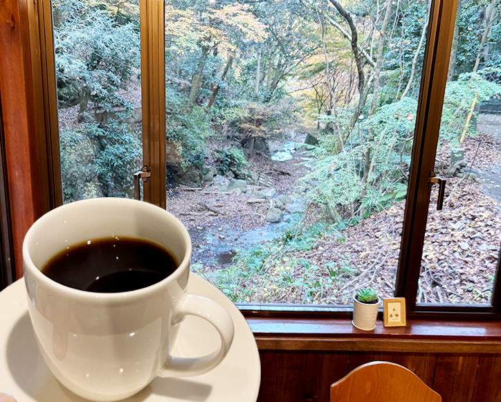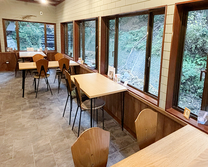 深い森林に包まれたお店は、夏にはクーラーに頼らず、窓を大きく開けて川のせせらぎをBGMに、ゆったりとした時間を過ごすことができます。四季折々の自然を間近に感じられ、「洒水の滝」を訪れたあとのひと休みにもぴったり。