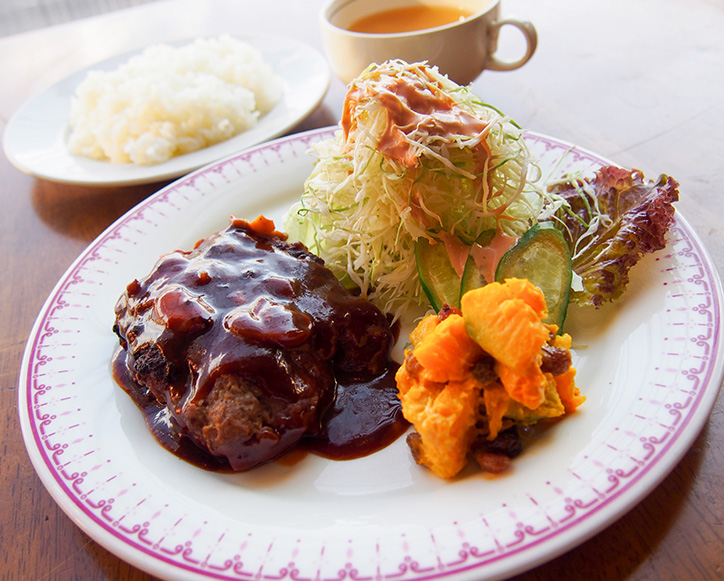 おすすめは、ハンバーグとカレーとピラフ。手作りソースや、旬の野菜を使ったサラダも好評です。カレーは、鶏がらスープから丁寧に仕込んでいるそうで、コクのある味わいが人気!