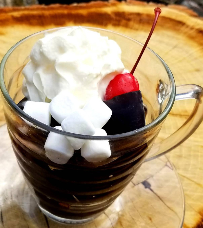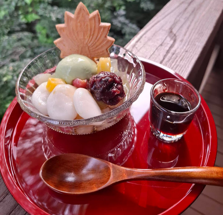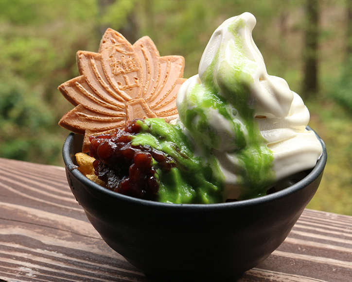 新緑や紅葉、野鳥のさえずりを楽しめる、大自然に囲まれたカフェで、ぜひ味わいたいのが「お茶碗パフェ」。ソフトクリームが乗っていて、季節によって中身が変わります。温泉あがりにちょっと食べたい時にもうれしい、ゆったりとした時間のお供にぴったりです。